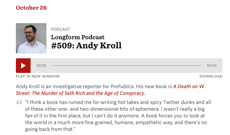 LISTEN: Andy on the Longform podcast Longform host Evan Ratliff interviewed Andy for Episode 509 of the podcast.Listen to the conversation here. Andy KrollOctober 26, 2022 Facebook0 Twitter LinkedIn0 Reddit Tumblr Pinterest0 0 Likes